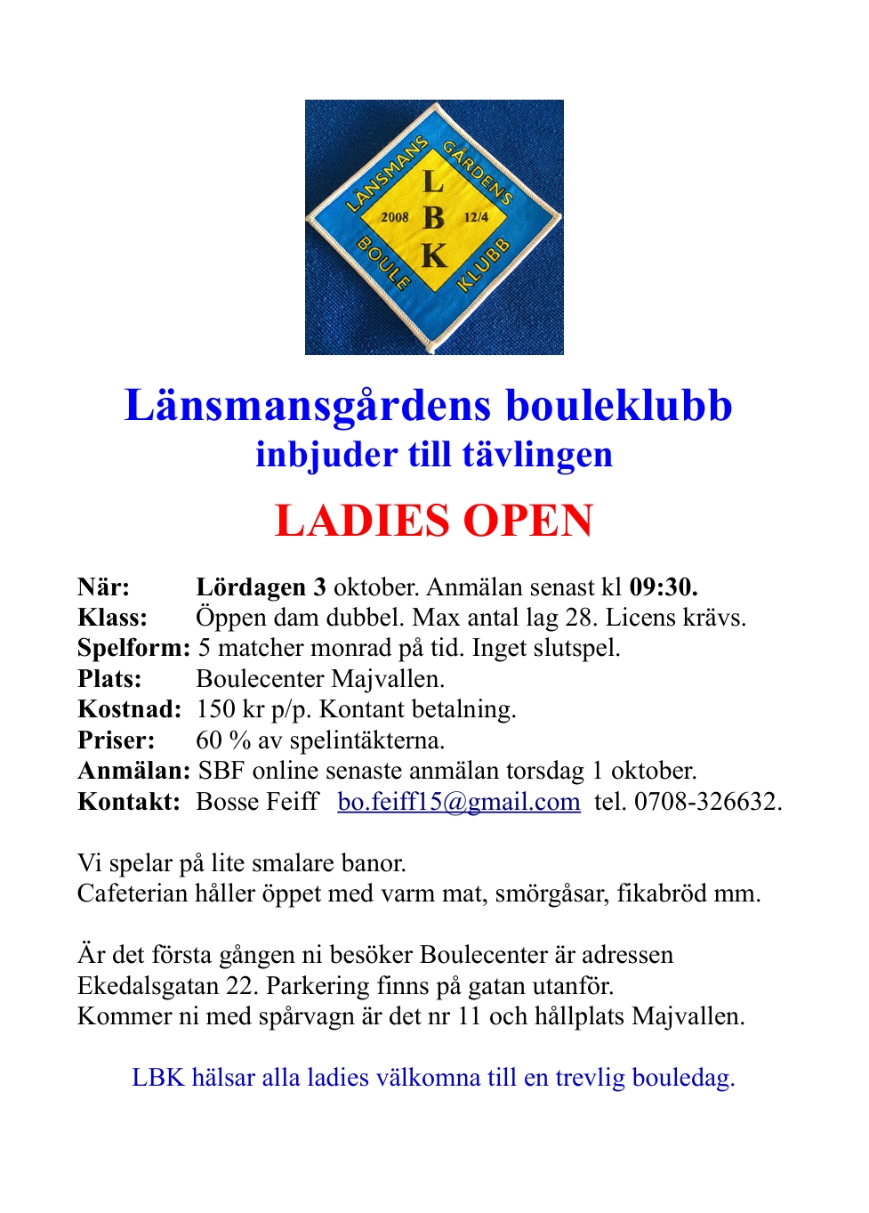 Länsmansgården inbjuder till en damdubbel i Majhallen 3 oktober. 28 lag tar vi emot och vi spelar 5 matcher monrad på tid. Lunch efter 3 matcher. 60% tillbaka i prispengar. Tävlingsledare Bosse. Sekretariatet Arne och Björn dömer. Välkomna