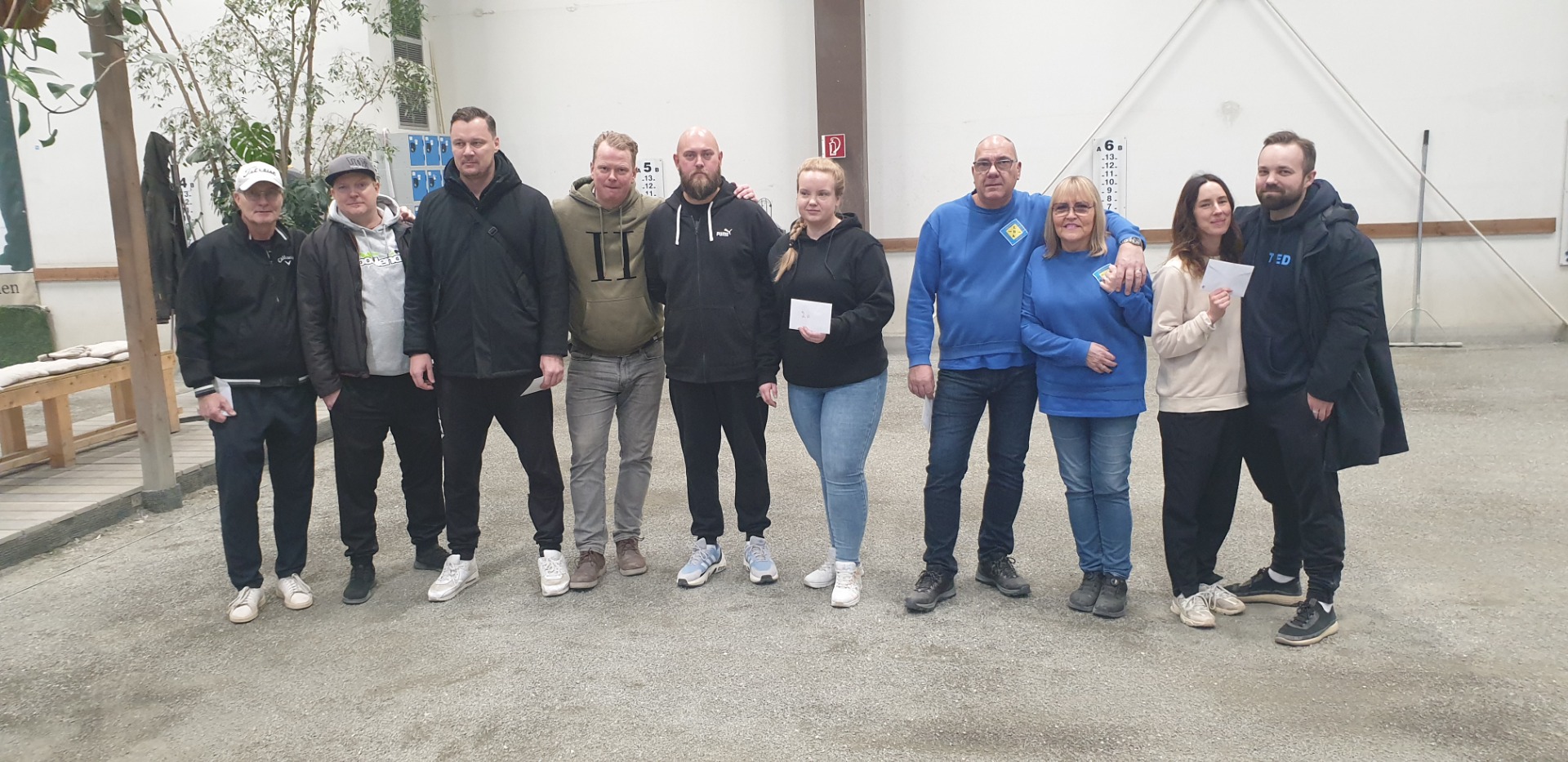 Lördagen 15 mars spelades Indoor open en öppen trippeltävling med ett starkt startfält. Vi hade 2 lag till start. Yvonne, Janne och Anders. Andra laget Evy, Arne och Bosse. Bägge lagen vann en match i poolen men förlorade skiljematchen. Bägge lagen till B-slutspel och efter vinst i åttondelsfinalen möttes vi i kvartsfinalen där en jämn match slutade med lag Evy som vinnare med 13-11. I semin förlorade lag Evy mot De la Boule. Bägge lagen var nöjda då motståndet var bra.